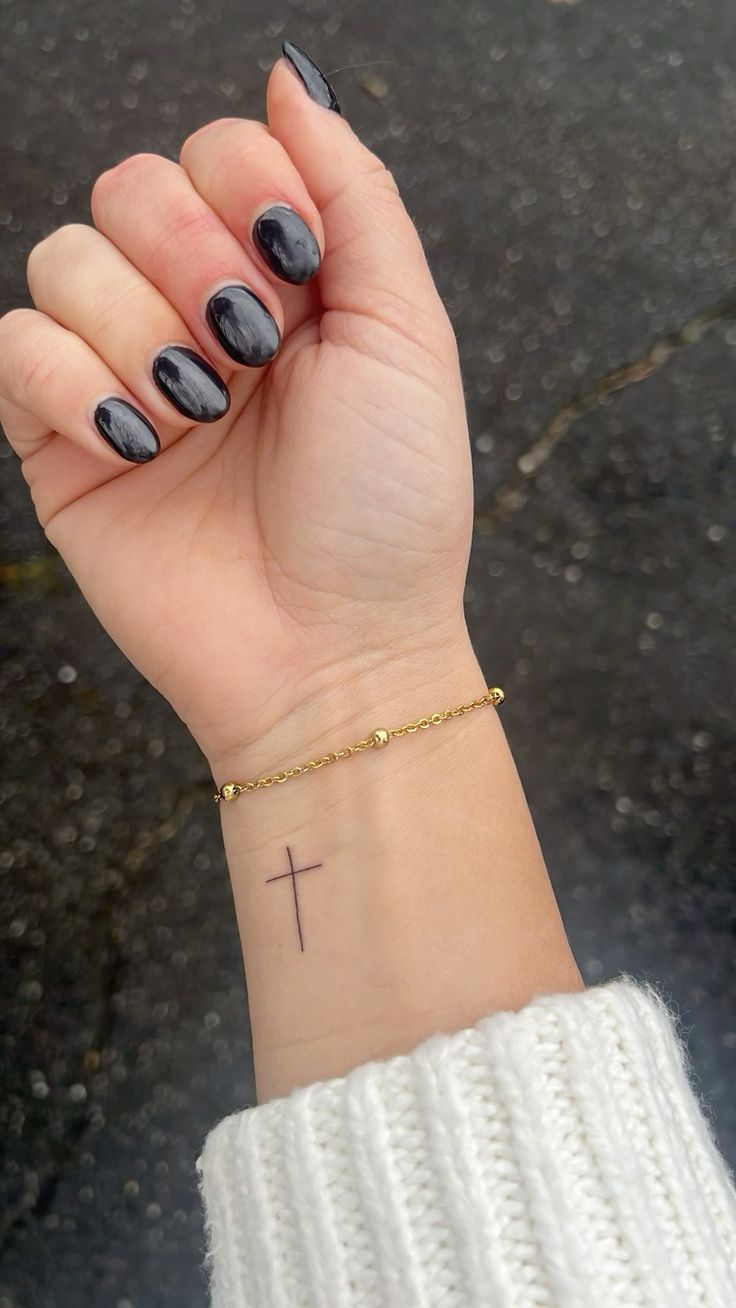 Compared with very thin fine-line tattoos, this slightly heavier design tends to age better over time. That makes it a smart option for placement on the wrist, where tattoos naturally experience movement and sun exposure. It’s a great design for women who want something strong but still clean, and it also works well for Men looking for simple cross tattoo ideas that feel timeless and masculine.