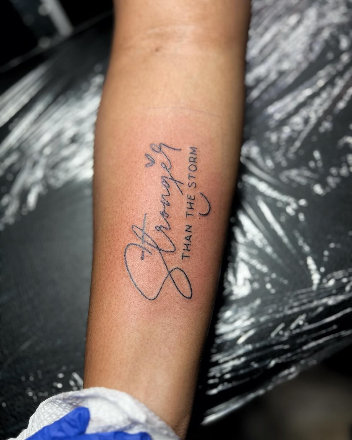 19. Stronger Than the Storm Script Tattoo