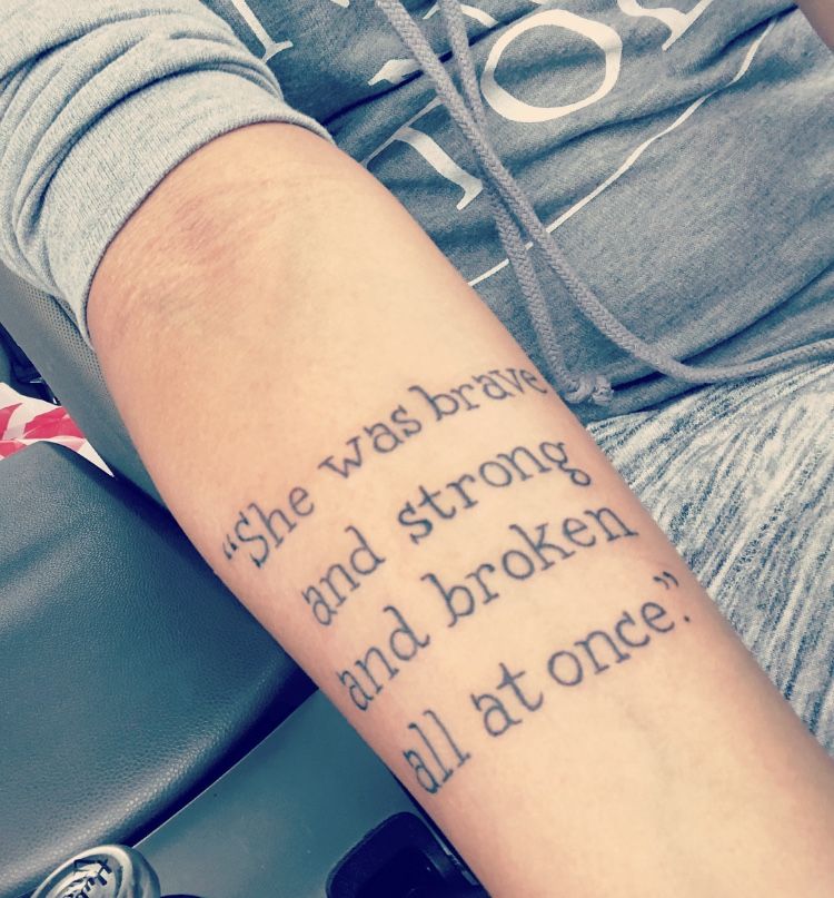 This tattoo reads almost like a line from a novel—the kind of sentence that makes you pause and breathe a little deeper. “She was brave and strong and broken all at once” captures the complicated beauty of being human. It’s raw, honest, and incredibly relatable.