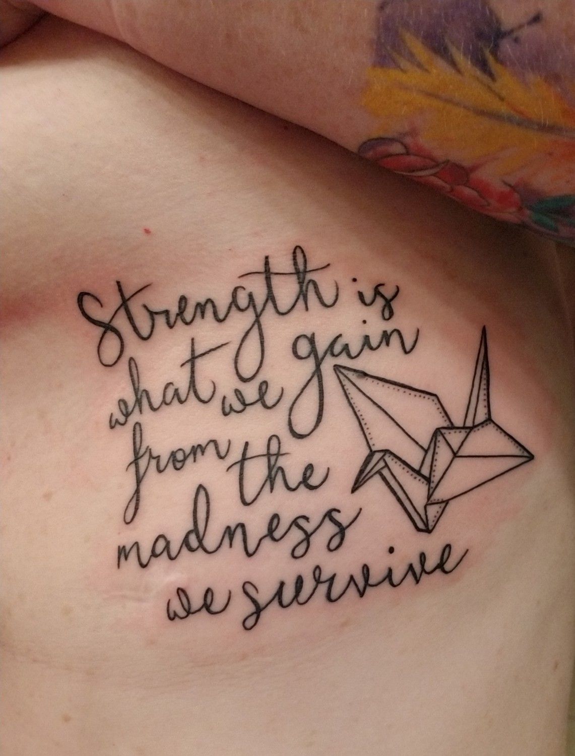 There’s something deeply emotional about the quote “Strength is what we gain from the madness we survive.” Paired with a delicate origami crane, the tattoo feels reflective and artistic. It tells a story of hardship, healing, and personal transformation—almost like a small chapter of someone’s life written on the skin.