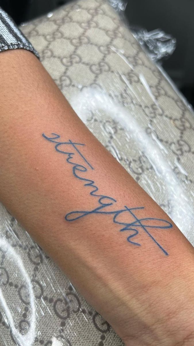 Sometimes a single word can hold an entire life story. This graceful “strength” tattoo written in flowing cursive feels almost like a signature of resilience. There’s something quietly beautiful about its simplicity—no extra symbols, no heavy elements, just the word itself standing strong on the skin.