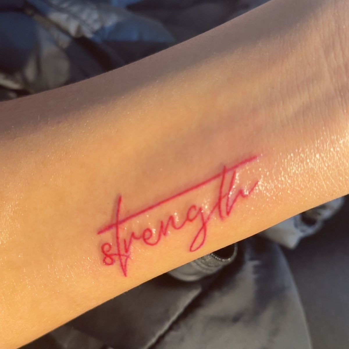 This tattoo immediately catches the eye thanks to its vibrant red ink. The word “strength” stretches across the arm like a confident signature, bold yet stylish. Red tattoos often feel more expressive and emotional than traditional black ink, which gives this design a modern, fearless personality. It almost feels like the wearer wanted their story of resilience to stand out proudly.