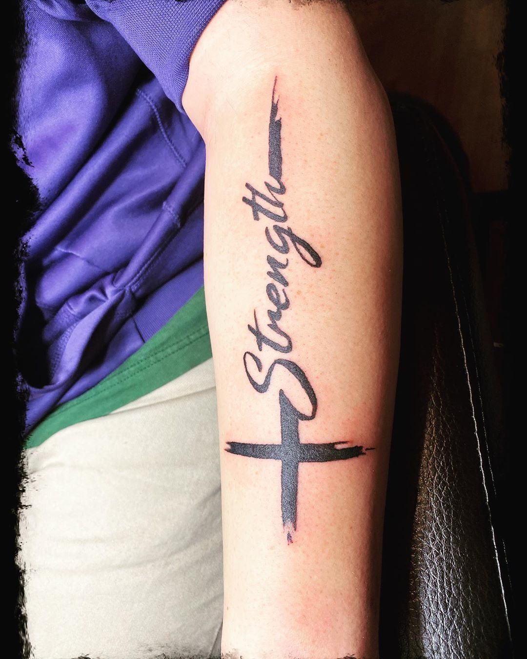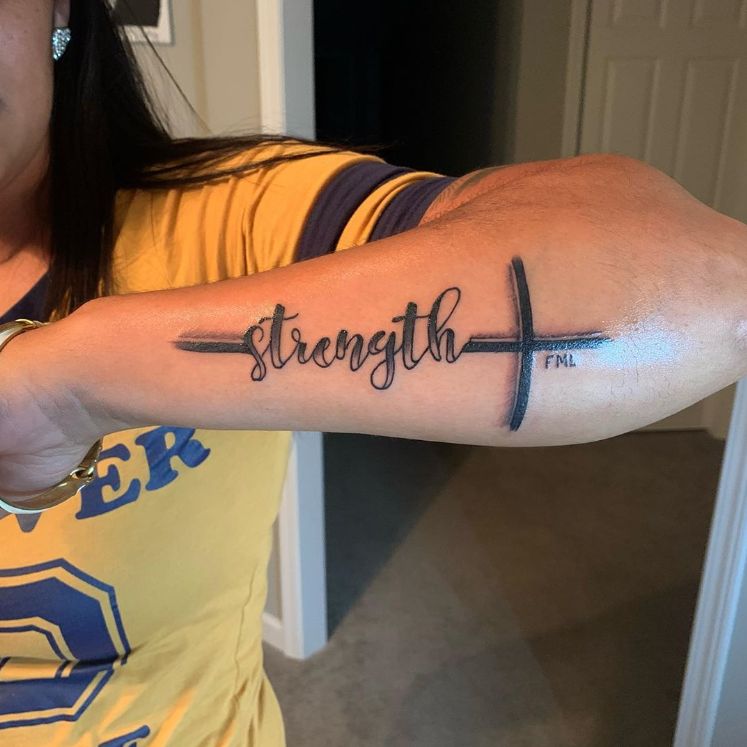 17. Cross and Strength Forearm Tattoo