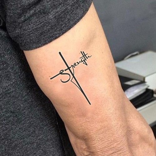 11. Bold Cross and Strength Script Tattoo