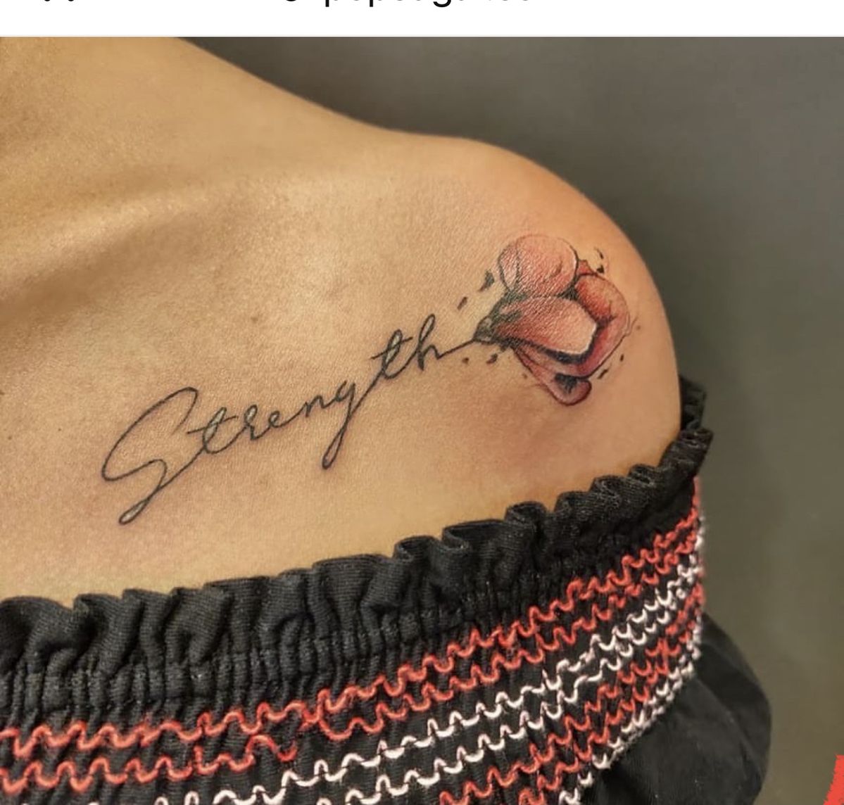 In terms of trends, colored script tattoos have been growing in popularity, especially among people searching for fresh tattoo ideas that break away from the usual black ink look. The clean script keeps the tattoo Feminine while the striking color adds attitude. For anyone exploring strength tattoo ideas for men or women that feel unique, this design offers a confident and stylish alternative.