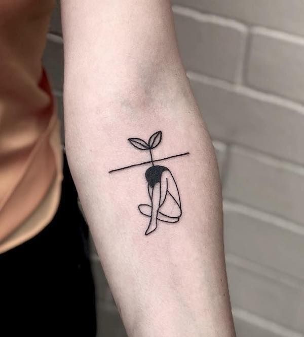This tattoo feels more like art than decoration. The small seated figure beneath a simple line and sprouting leaves creates a subtle but powerful visual metaphor. It suggests growth from within—the idea that strength often develops quietly beneath the surface before it finally blooms.