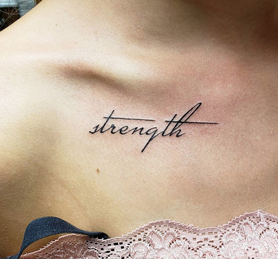 There’s something incredibly chic about a collarbone tattoo. The word “strength” written in a simple, flowing script sits perfectly along the natural line of the collarbone, creating a design that feels delicate yet confident. It’s subtle, elegant, and undeniably stylish.