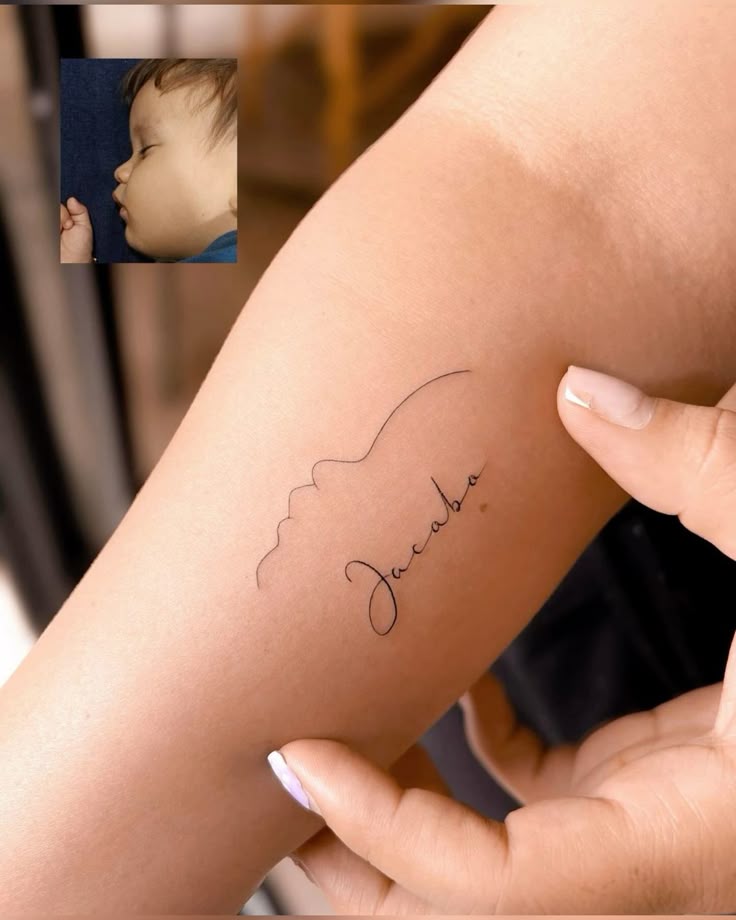 This small profile design is, of course, all about being simple, featuring a smooth line drawing of your sleeping child’s features, along with your child’s name tucked discreetly along your arm, as though it’s being shared as a secret lover’s whisper. It has a distinctly modern, artistic feel, as though it’s a temporary doodle a graphic artist would do while sitting on your couch, doodling a portrait of a sleeping child on your skin while cuddled up on your lap as you both catch a snooze. It’s a fabulous, discreet, personal way for parents to have a piece of their kids on their person without hitting everyone over the head.