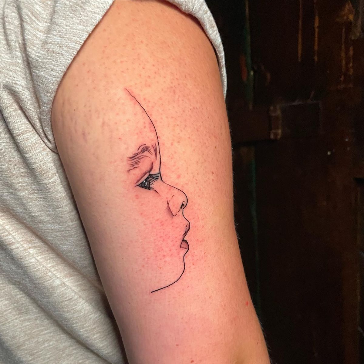 This side profile catches that serious little expression babies get when they’re studying the world, all cheeks and long lashes and tiny pout. The simple outline keeps things clean, while just a hint of shading around the eye adds depth, so it still feels like your own girl or boy rather than a generic sketch. It’s one of those tattoo baby ideas that feels intimate and grown-up at the same time—no extra symbols, just that unforgettable little face.
