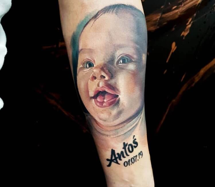 18. Gentle Baby Portrait Tattoo With Flowing Script