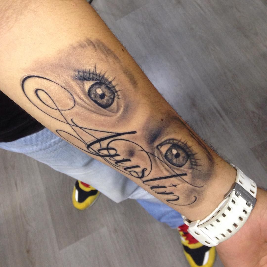 Those big baby eyes that once watched you from the crib are captured forever in this stunning realism piece. Every eyelash, highlight, and tiny reflection looks alive, almost as if your child is peeking out from under your sleeve. The sweeping script name below grounds the portrait so there’s no doubt whose gaze this is, and it turns your forearm into a little framed photo you carry everywhere. It’s intense, emotional, and impossible to ignore—in the best way.