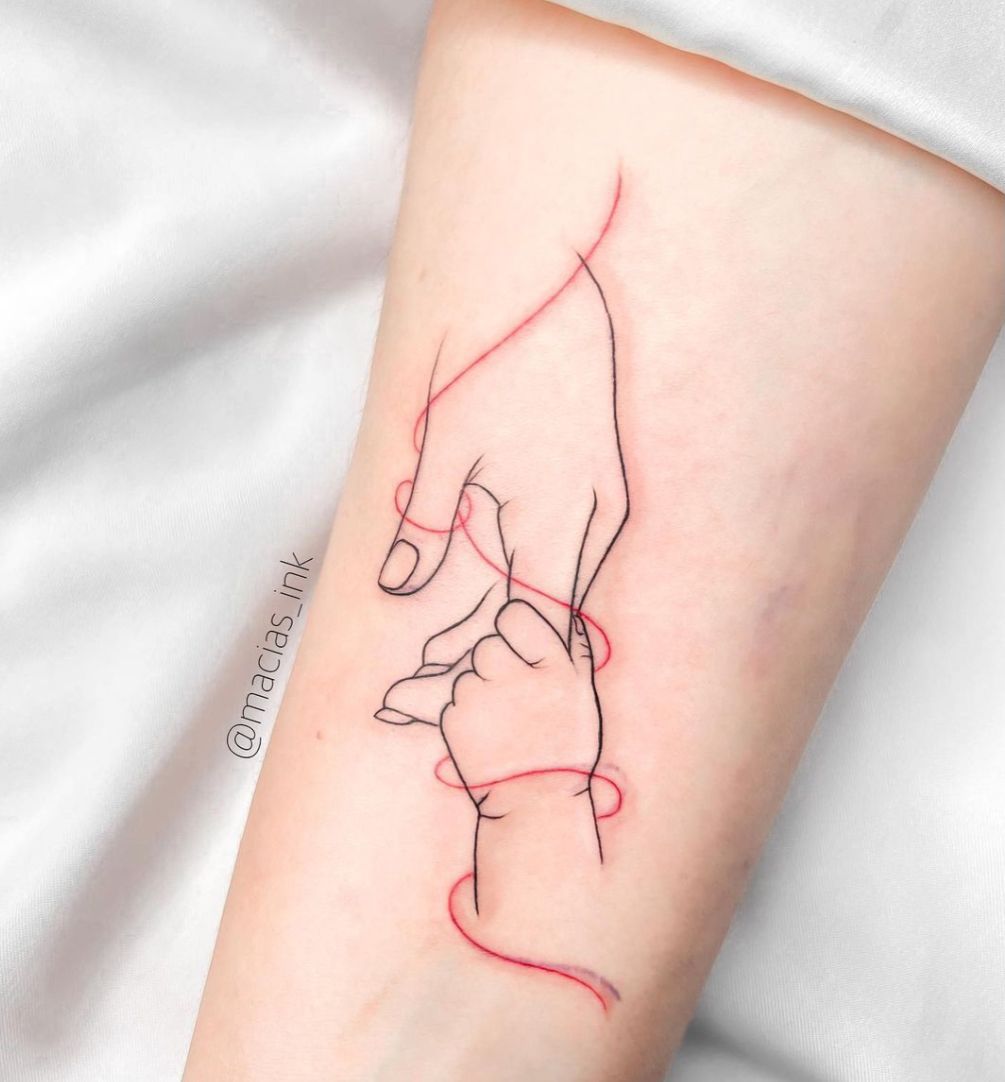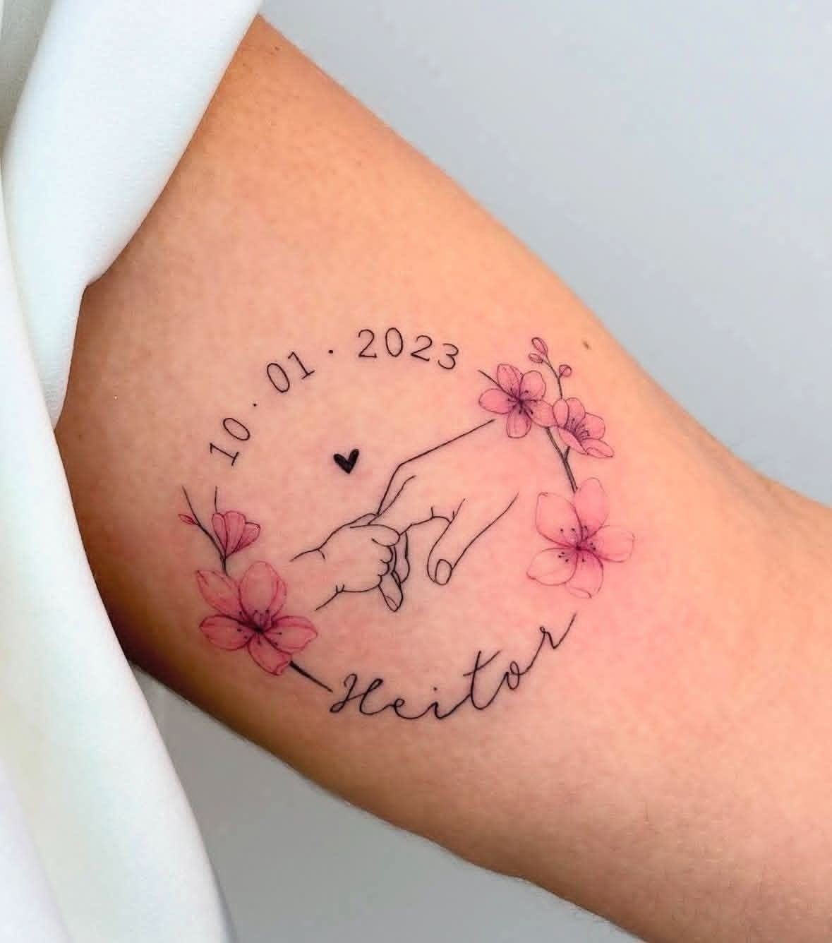 This design is lovely for women who want something subtle but still clearly about family. It suits almost any skin tone and works beautifully for mom-daughter or mom-son bonds, especially if you don’t love the look of bold handprint or Fuß tattoos. Fine-line silhouettes like this are ideal for the calf, forearm, or just behind the upper arm where it peeks out from a sleeveless top. If you’re a small-flower person in real life—floral dresses, delicate earrings—this tattoo will slide right into your style without competing.