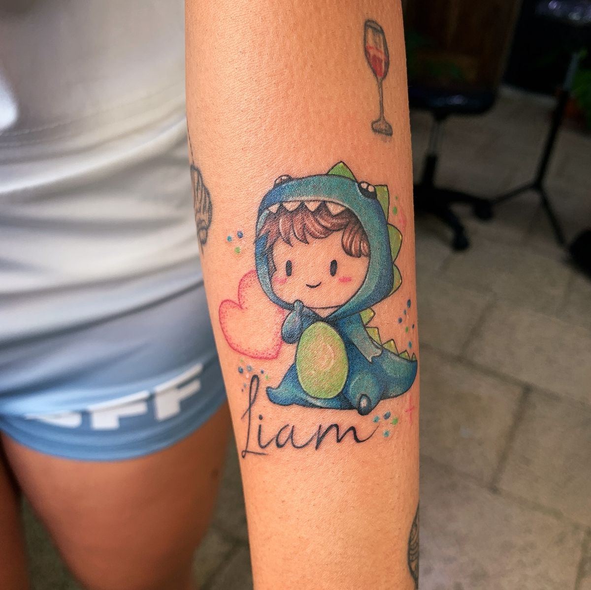 This incredible dinosaur costume tattoo looks like your kiddo got an invite to a birthday party. It appears as though he crashed the event, though, as it has a storybook quality about it. The bright blue suit, red cheeks, and little claws mean it’s storybook cute, while the flowing script of his name below means it’s a memory piece. It’s playful without being juvenile. It’s a good thing a heartfelt, on-the-go mom or dad took notice, though, because it looks as though his personality is a close second to his looks. This type of artwork is ideal for parents who consider their child to be the star of their adventures. If your family loves theme parks, baby shower theme costume parties, or dress-up days, then this is definitely one of those ideas for mom or ideas for dad topics that fit right in. The colors really pop on the forearm, and having a clear name keeps everyone’s attention on your little angel, as opposed to a random kid’s character.