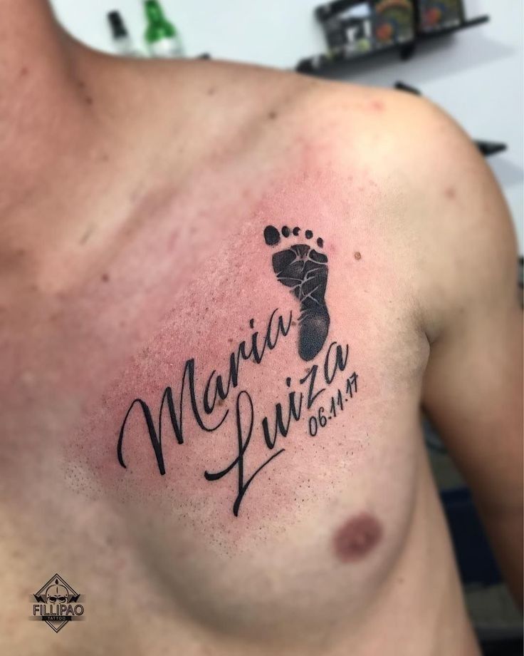 What’s so cool about this design, though, is the amazing mix of statement pieces and personal, intimate art. Chest pieces can be pretty loud, but this one remains classy and classic, with those smooth lines and simple colors. It’s a sweet idea for a dad wanting a strong, powerful piece of artwork that’s got emotion, too, or a mom loving V-neck tees, wanting this small footprint peeking out as some kind of hidden secret. Plus, you can reverse it all someday, putting a whole new footprint or name on it to mirror the design, should a brand-new girl or boy join the mix.