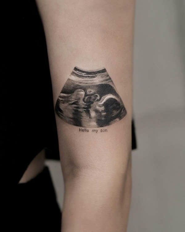 An ultrasound silhouette tattoo commemorates the very first glimpse of your child’s face on a small monitor screen, a kind of fuzzy black-and-white image of a life, which promises everything will be all right. And this subtly shaded silhouette, along with those small words under it, such as “hello my son” or whatever message you’d like, can be a kind of love letter within the earliest weeks of your pregnancy, especially so for those parents whose first sensation has been a kind of claim on their mother’s or father’s heart.