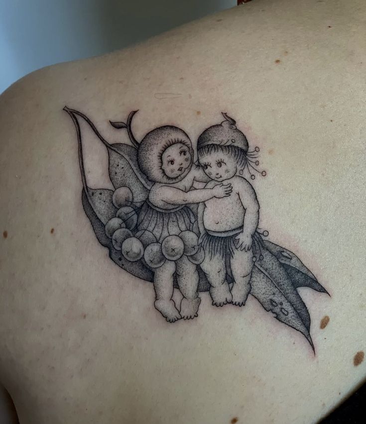 This sweet piece looks as though it has wandered straight from a children’s storybook illustration. It shows two chubby babies hiding inside a pea pod, reaching to steady a fellow tot. It is sweet, whimsical, and a very special way to celebrate having twins, as well as a girl and a boy born at different but special moments in your life, both residing in the same pod in a very special way within your soul. The dot work creates a soft, ethereal quality that is so very easy to fall in love with.