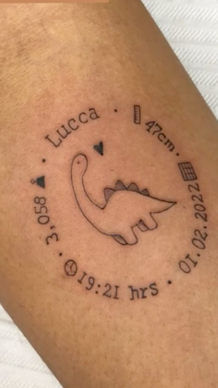 The vibe of this tattoo design is playful, happy, and slightly offbeat. It’s an excellent choice for parents who think of themselves as untraditional but want a special, memorable way to recall Geburt specifics. A footprint or handprint portrait just isn’t as interesting as a personality that can evolve along with your kiddo—you can start off with a baby dinosaur, but in a couple years, it might be more like a cool lion they can admire. It’s the kind of tat on the ankle, calf, or forearm that radiates a message about being a “fun mom” or “cool dad” without necessarily having to be so overt about it.