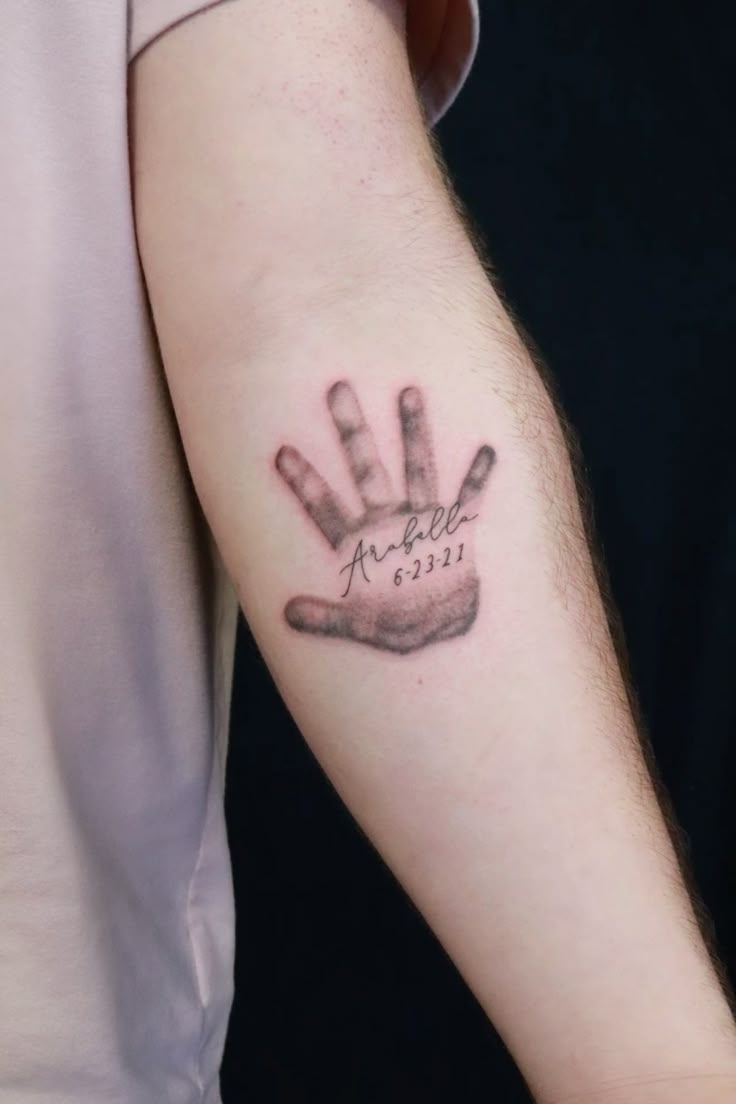 Because of how elegant this design is, it looks amazing paired with jewelry as well as everyday fashion. On the interior of the forearm, it’s completely natural, particularly as a mom’s arm with stacks of bracelets and a simple watch. The idea of a “for Mom” design can be pushed further to include a small heart, star, or flower incorporated close to the name, though it can be completely simple as well. The very light, thin-line approach to the shading makes it heal well without overwhelming other tattoos, so it’s simple to layer additional ideas based on “Dad”-themed pieces as well as a second baby’s footprint in the future.