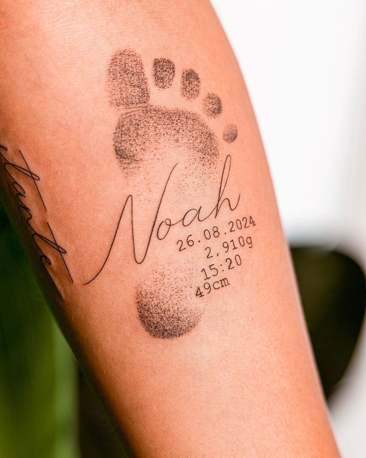 What really takes this piece to another level, though, is the fact that everything revolves around this one Fußabdruck. Rather than placing it inside a floral wreath or a clock, the piece allows the print and birth stats to speak for themselves, making it a sleek, ageless option. If you’re a mom or a dad, though, and you’re passionate about order and special numbers, this is definitely one of those tattoo ideas for babies that feels as though it were specifically designed for you—not so much a decoration, but more a special document you can always find.