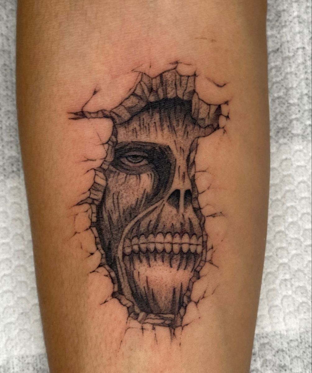 If you love subtle creepiness more than full-on gore, this cracked-wall titan face is such a clever design. It looks like the skin has split just enough for the skull-like features and tired eye to peek through, giving you that classic series tension without needing a huge scene. It’s the kind of tattoo that makes people lean in for a closer look, then realize what they’re seeing—a perfect mix of horror and elegance that works beautifully on toned calves or ankles.