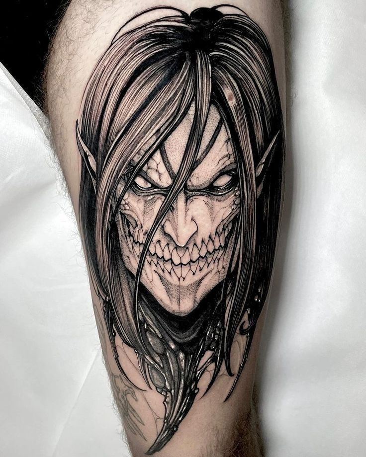 Here’s a bolder, darker side of your Attack on Titan ideas: a close-up of that terrifying grin, hair spilling forward, and eyes glowing with intent. This portrait leans into pure power, the kind you tap into when you’re done apologizing for taking up space. It’s dramatic, unapologetically intense, and turns your leg into a tiny movie poster for the rumbling inside you. If you’ve ever felt like you carry two selves—the calm everyday woman and the one who could level a room when pushed—this founding-titan-inspired piece will feel oddly therapeutic.