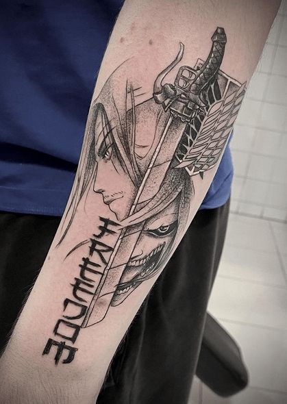 Here, the profile of Eren is sliced cleanly by a sword, revealing the titan sneer beneath and the word “freedom” marching down your arm. It’s such a clever design, almost like a reminder that your own power lies just beneath the surface, waiting for the right moment to cut through. The slim composition keeps everything sleek and flattering, especially if you love tattoos that look like they were designed just for the line of your forearm.
