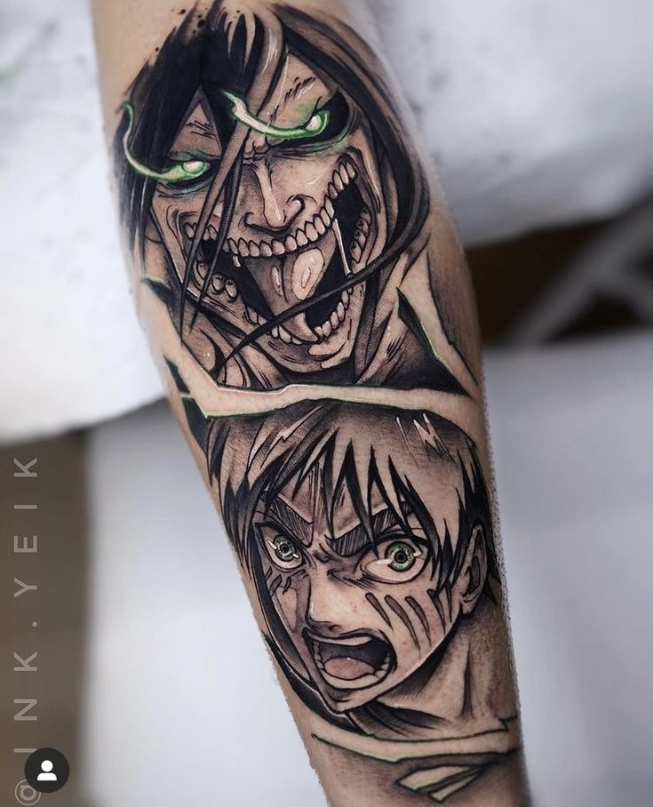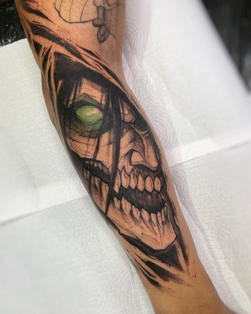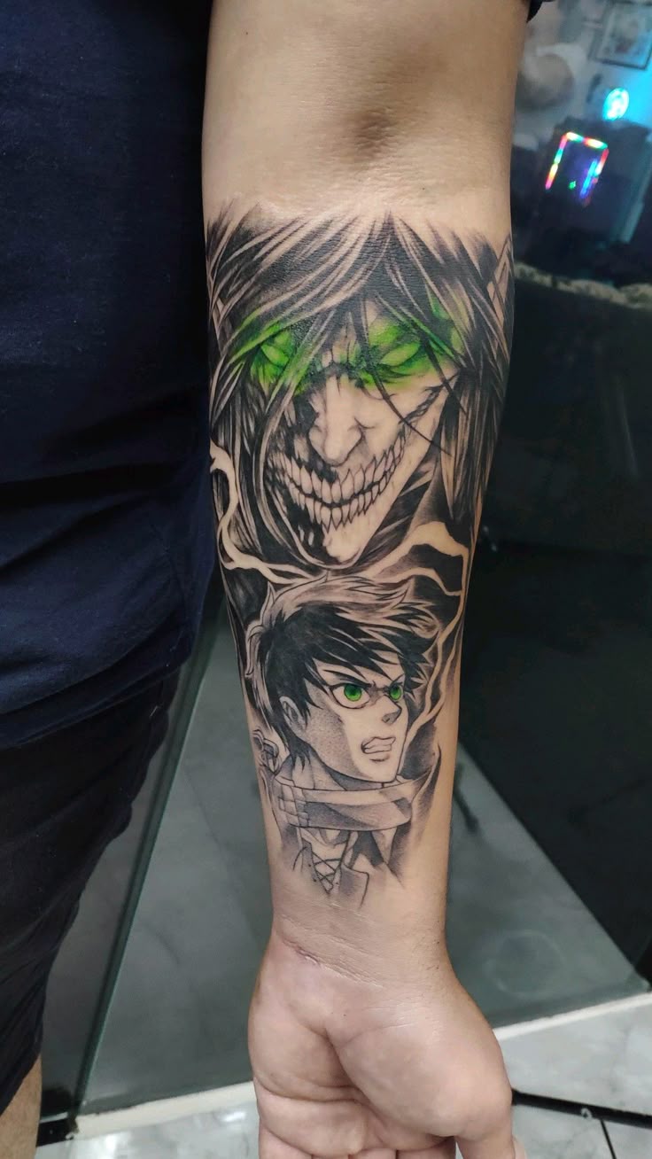 Here the titan’s eyes blaze like neon while human Eren stands ready below, framed by crackling shapes that feel like pure transformation energy. It’s one of those Attack on Titan tattoo ideas that practically hums with motion, as if the shift between forms is happening right there on your arm. The mix of soft grey shading and bright green details keeps the design intense but still elegant enough to sit beside your everyday jewelry and watch.