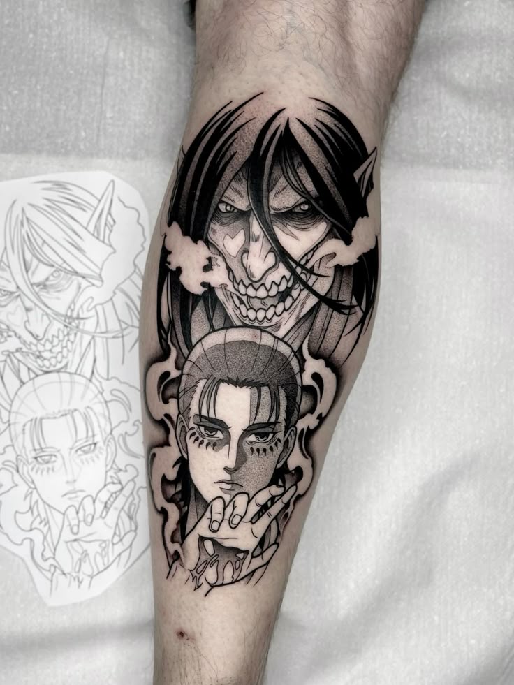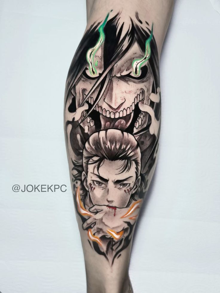 This leg piece layers human Eren at the bottom with his titan looming above, framed by glowing details and smoky shapes that feel almost supernatural. It’s one of those big, dramatic Attack on Titan tattoo ideas that turns your calf into a full story about transformation, sacrifice, and inner conflict. The orange and green accents bring just enough color to keep it lively without stealing focus from the expressive faces. If you love the theme of duality—soft and strong, human and titan—this design nails it.
