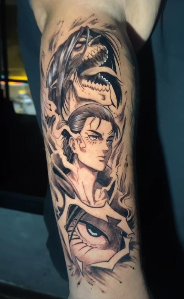 As a forearm or half sleeve, this piece shines on women and men who like movement and depth in their tattoos rather than flat, traditional blocks. Ask your artist to play with contrast: softer grey washes around the human Eren, sharper shading and texture on the titan details, and maybe a hint of texture around the eye to pull focus. Think of this as your inspo foundation—you can add quotes, tree silhouettes, or small symbols later to build your own evolving sleeve without losing the central storyline.
