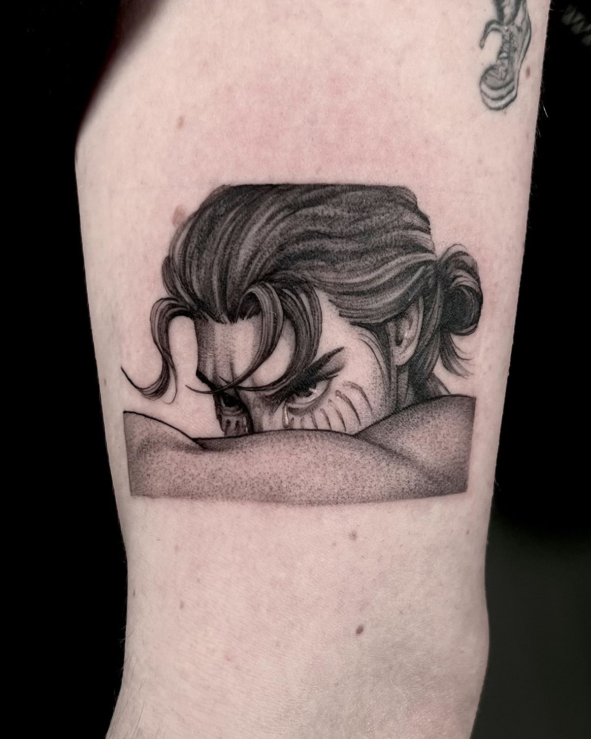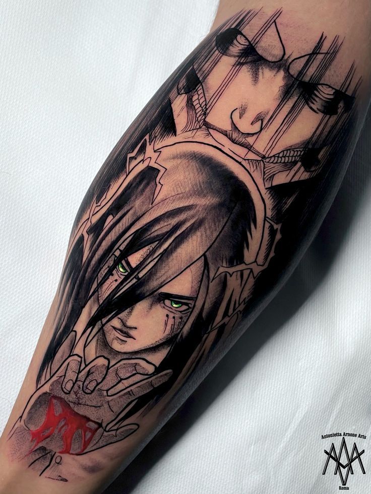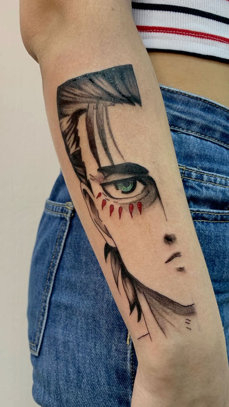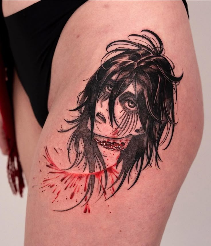 This bold thigh piece leans into the darker side of Attack on Titan, with a wide-eyed character, hair spilling everywhere, and a burst of blood-red ink slicing across the neck. It’s gothic, emotional, and strangely beautiful—a reminder that even in a brutal world, there’s room for fragile humanity. The contrast between soft, flowing hair and the sharp red details makes the whole thing feel like a moving frame from the anime, frozen at the most dramatic second.