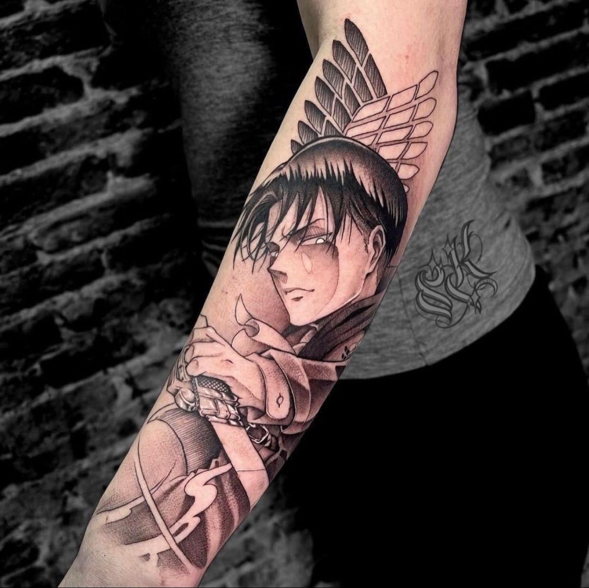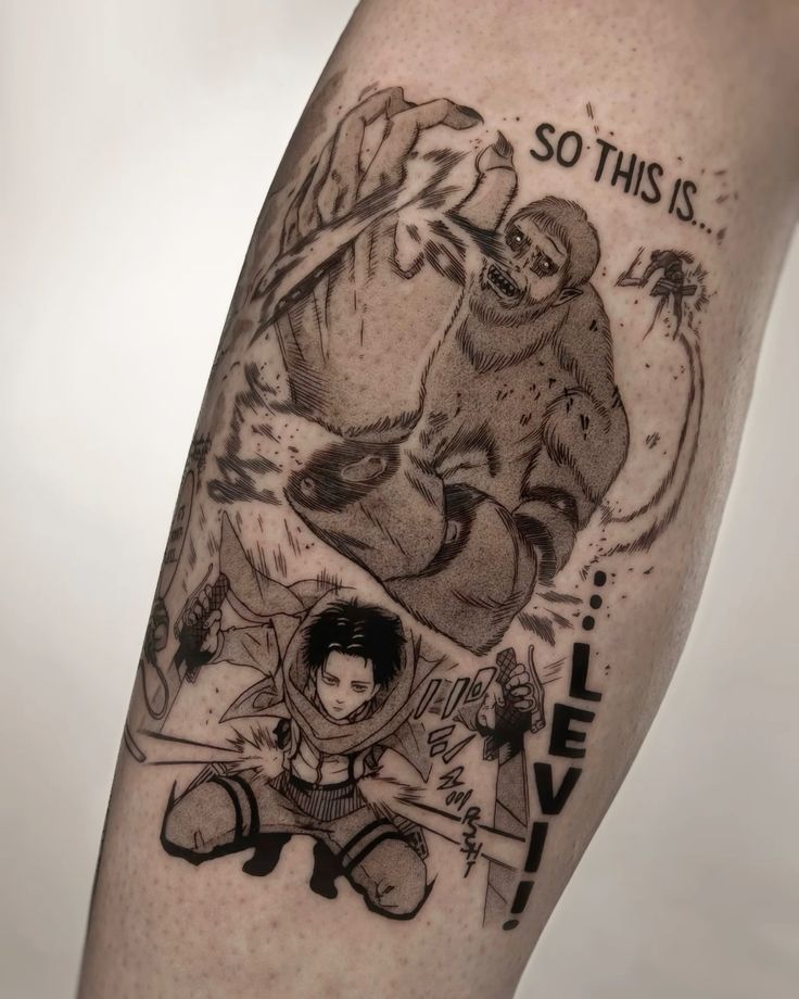 This tattoo freezes one of the most iconic Levi moments: his showdown with the Beast Titan, complete with swirling debris, motion lines, and that bold text screaming his name. It’s basically a love letter to ruthless efficiency and quiet rage, the kind of energy you channel when life underestimates you one too many times. The layout feels like a manga page torn straight from the volume, which makes it a great choice if you want a design that looks dynamic even when you’re standing still.
