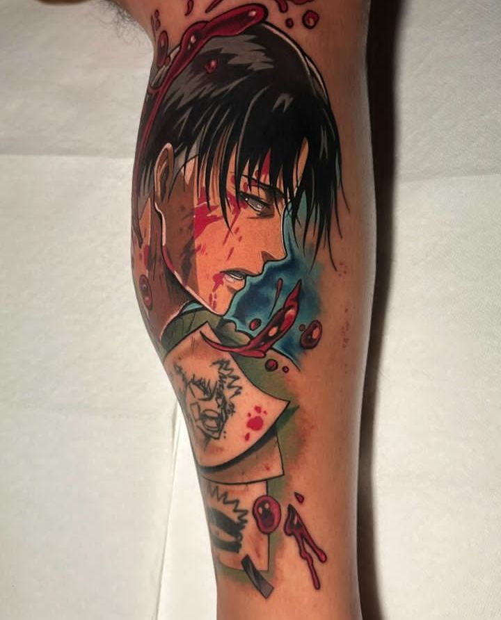 This vivid Levi piece explodes with color and motion, as if you’ve captured a single frame from a brutal fight and frozen it on your leg. The splashes of red, the determined profile, and the hints of ODM gear give the tattoo an almost cinematic feel—perfect if Levi is your forever favorite and you relate to his quiet, cutting strength. It’s dramatic without being chaotic, and the rich turquoise and crimson tones pop beautifully against warm skin.