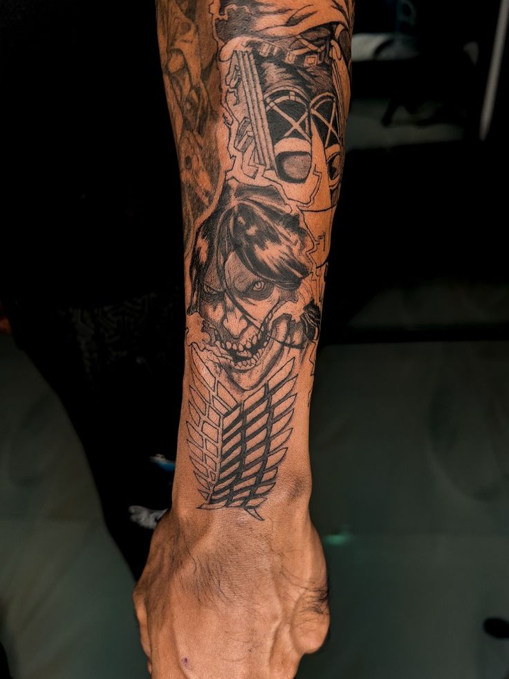This long, narrow composition runs from the wrist toward the forearm, stacking the snarling titan face with ODM gear details and the wings symbol at the base. It feels like a mini sleeve in one go—busy in the best way, full of movement and sharp angles. The titan’s grin adds that chaotic edge, while the emblem keeps it grounded in the values of courage and camaraderie. If you like your tattoos to tell people, “I’m sweet, but don’t test me,” this is a beautiful way to say it without uttering a word.