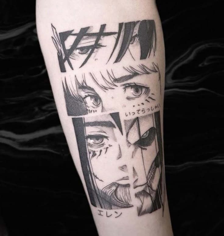For men and women who love clean lines and storytelling, this manga panel design is such a smart Attack on Titan tattoo idea. Cropped eyes, sharp angles, and those tiny bits of text create the feeling of a favorite page pulled straight from the volume. You get hints of Eren, hints of ideas from Armin, and the sense that something important is about to be said—even if the actual quotes stay just between you and the series. It’s graphic, modern, and feels almost like a little black-and-white gallery on your skin.