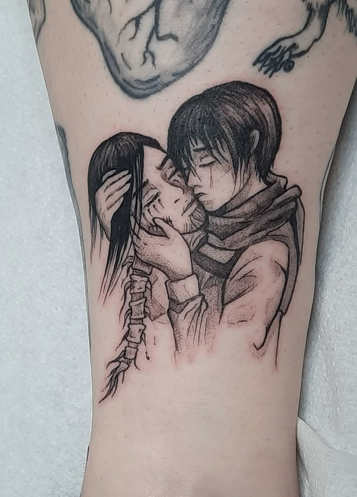 This tender Eren and Mikasa design captures the kind of love that’s messy, painful, and absolutely unforgettable. The way she cradles his face, eyes closed and still holding on, feels like that moment when you decide to love someone even when everything is falling apart. As a woman, you might see your own story in this scene: the years you’ve spent being strong for everyone else and the softness you keep for the people who really matter. It’s a beautiful couple tattoo idea when you want your skin to whisper a private quote about loyalty and sacrifice rather than shout it.