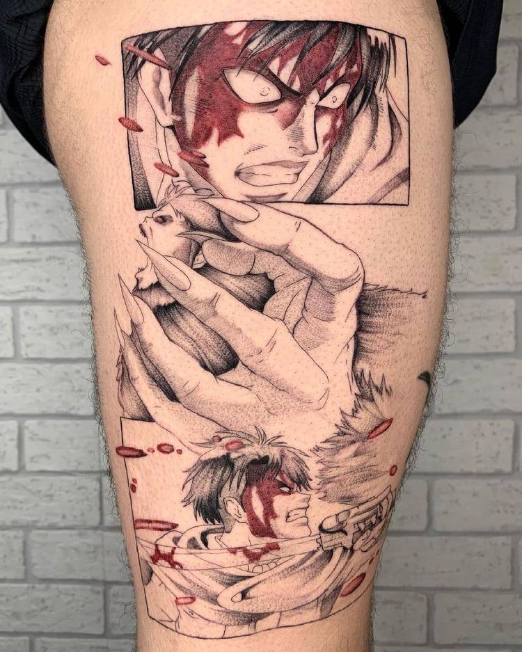 This multi-panel thigh tattoo captures Eren mid-battle, framed by a giant hand and splashes of deep red that guide your eye from top to bottom. It reads like a mini comic on your skin: shock in his face, the grip of fate around him, and the desperate fight that follows. If you love Attack on Titan tattoo ideas that feel like pure adrenaline, this is a gorgeous way to carry that energy with you, especially on days when you need a reminder that you’ve already survived tougher seasons than this.