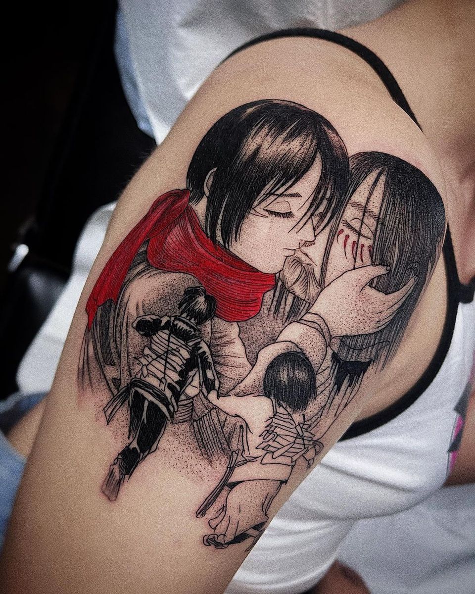 23. Eren and Mikasa Red Scarf Shoulder Tattoo
