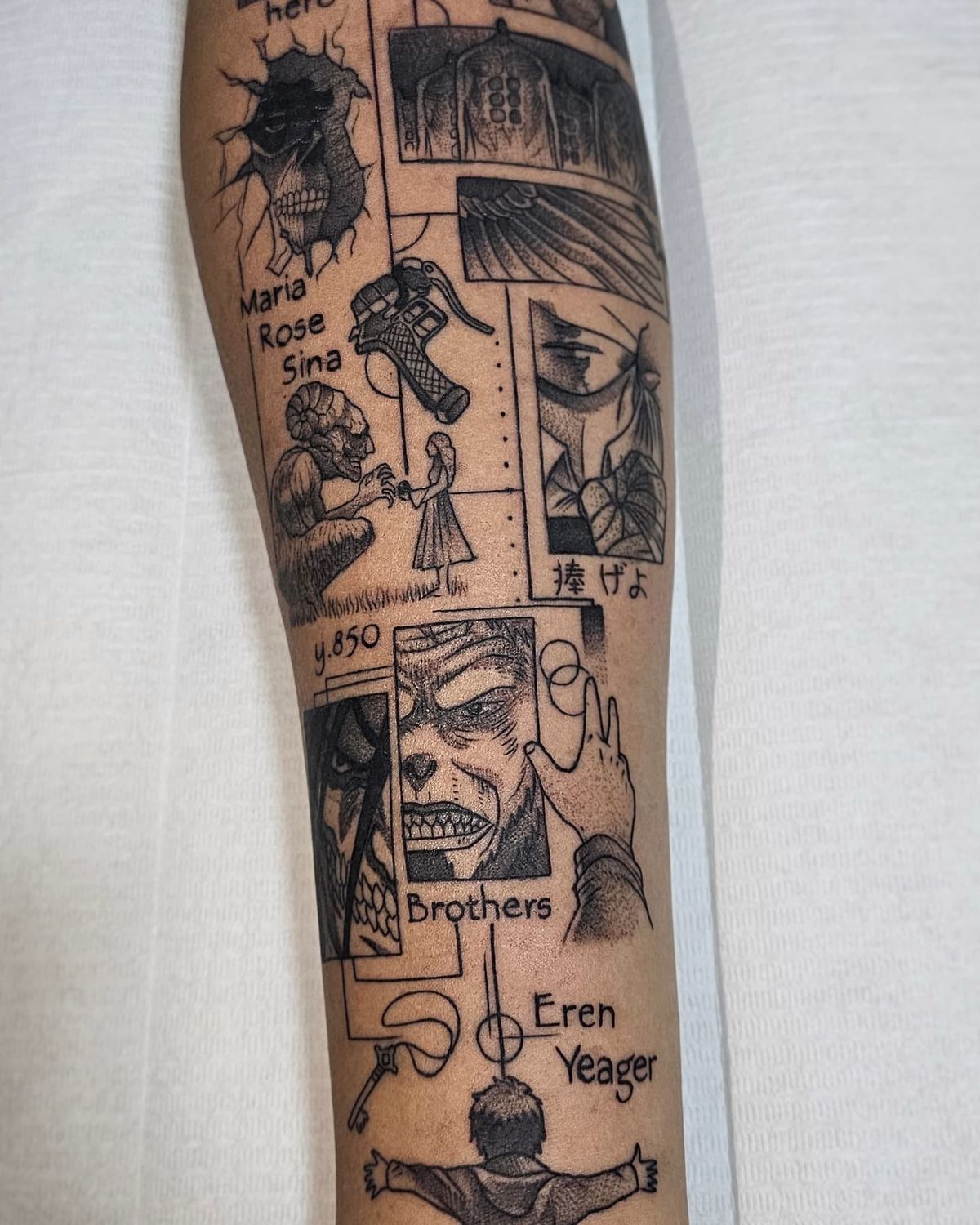 If you’re the kind of fan who remembers exact chapters and tiny details, this manga-strip tattoo is pure inspo. Panels of the walls, titans breaking through, the word “Brothers,” and Eren Yeager’s journey all weave together into a personal timeline on your skin. It feels less like a single image and more like a scrapbook page, where every box holds a memory—of late-night binges, favorite quotes, and the first time the story truly shocked you. It’s one of those Attack on Titan tattoo ideas that invites people to read your arm like a page out of the series.