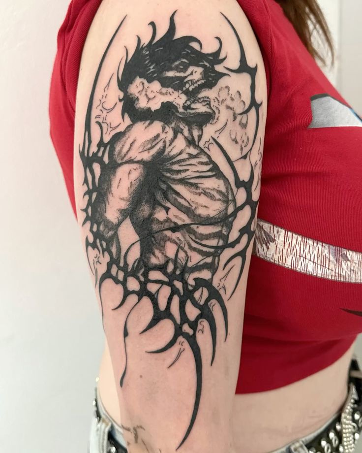 10. Abstract Titan Silhouette Upper Arm Tattoo
