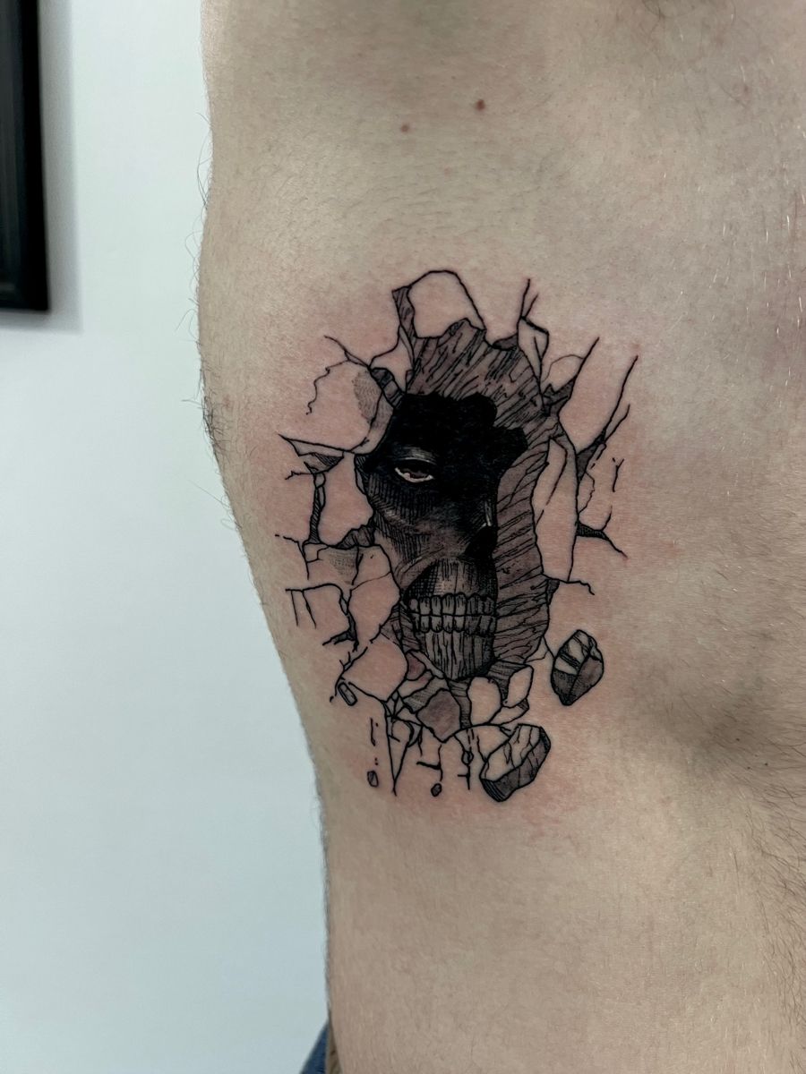 Compared to big, busy sleeve ideas, this one stays compact and simple, which makes it ideal if you’re dipping your toes into anime tattoos for the first time. It sits nicely alongside other minimalist pieces, and because it relies on fine blackwork and soft shading, it ages more like a delicate illustration than a bold patch of ink. If you already have floral or geometric work, this cracked titan motif can bridge those styles, adding just enough edge without overwhelming your existing collection.