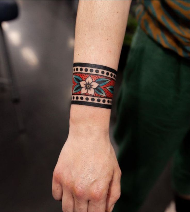 This bracelet tattoo has personality. The bold colors and folk-inspired flower motif feel expressive, confident, and full of character. It’s the kind of design that instantly becomes part of your signature style.