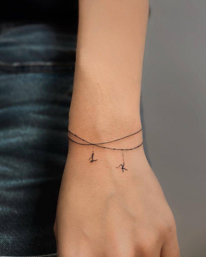 This is quiet luxury in tattoo form. A thin line wrapped around the wrist with tiny initials feels modern, intentional, and deeply personal. It doesn’t ask for attention—it earns it through simplicity.