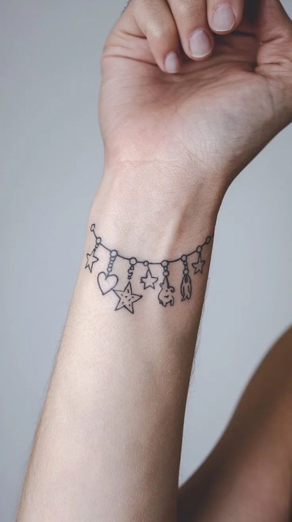 Charm bracelet tattoos like this are ideal for women who want something meaningful yet fun. The fine line design keeps it airy and delicate, making it easy to wear with everyday outfits. It’s also a lovely option for friendship tattoos or shared symbols between loved ones.