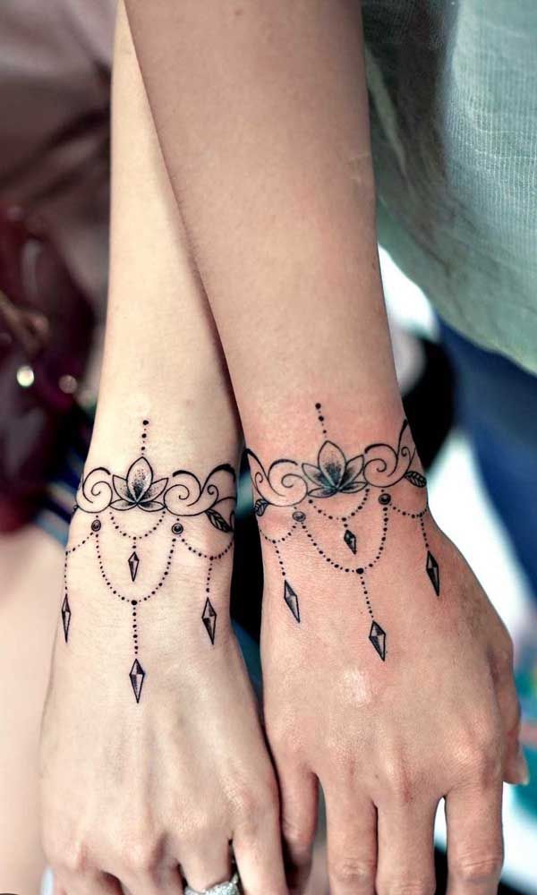 There’s a beautiful sense of connection in these matching designs. The flowing lines, tiny dots, and hanging elements feel delicate and meaningful—like a shared secret worn on the skin. It’s romantic, symbolic, and emotionally rich without being overly dramatic.