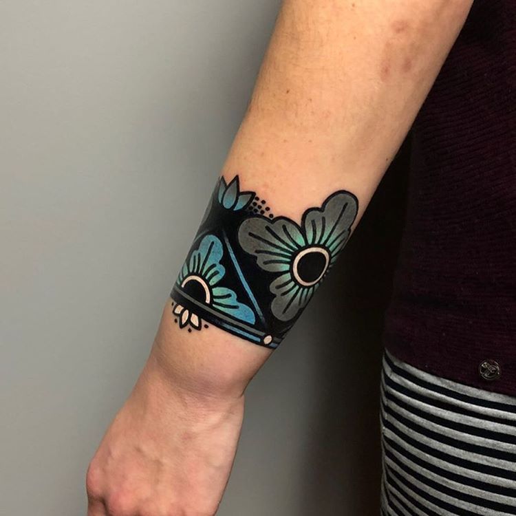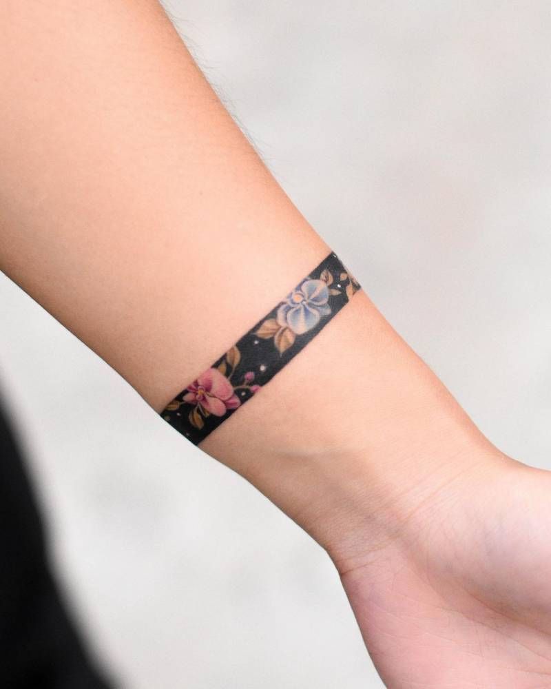 This design brings a fresh, modern twist to the classic wristband tattoo. The bold flower shapes and unexpected color accents make it feel artistic and playful, like a piece you’d find in a boutique gallery. It’s confident, creative, and impossible to ignore.