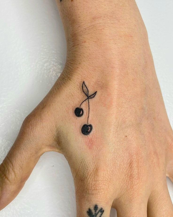 There’s something undeniably charming about a Tiny cherry sitting on the hand. It feels spontaneous, youthful, and just a little rebellious. The simple outline keeps it light, almost like a small signature you carry with you every day.