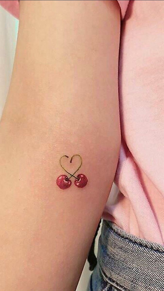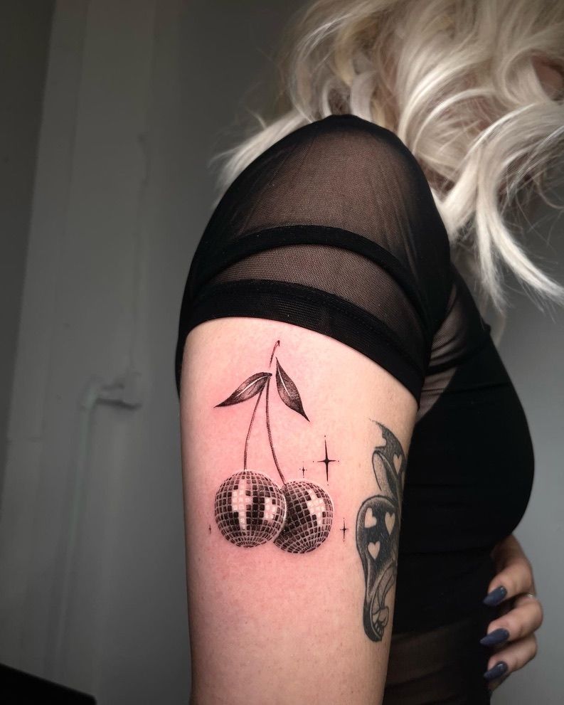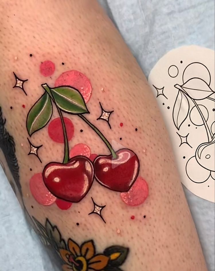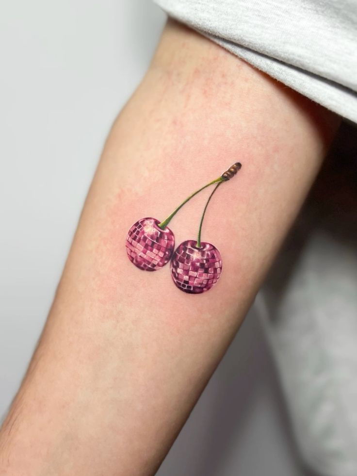 This design feels like summer fireworks in miniature. The glossy red cherries paired with soft pink circles and sparkles create a playful Disco vibe that feels joyful and celebratory. It’s bold but not overwhelming—the kind of tattoo that makes you smile every time you catch a glimpse of it.
