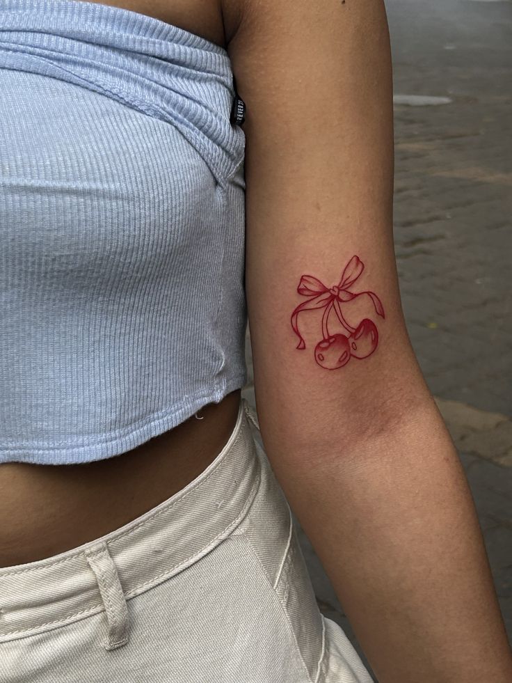 If you love Simple stencil-inspired tattoos, this one is a dream. The fine red outline gives it a subtle glow against the skin, and the bow detail adds feminine charm. It’s ideal for upper arm placement and works beautifully for women who want something sweet but modern.