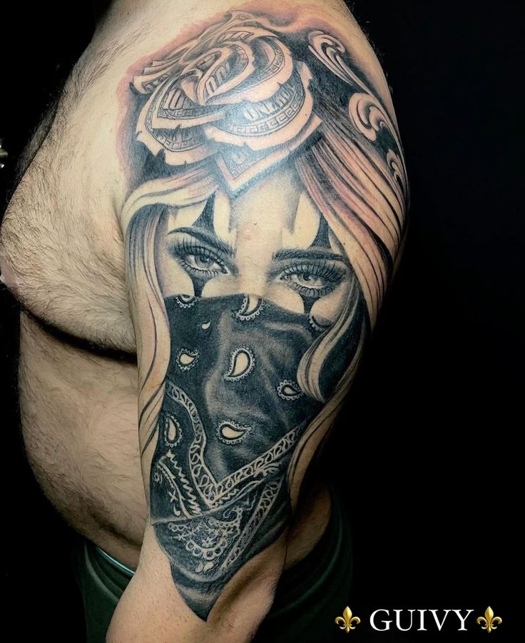 This tattoo leans heavily into classic Chicano storytelling—bold, expressive, and layered with symbolism. The mask imagery paired with money references speaks to survival, identity, and ambition, all wrapped in Oldies-inspired style that feels timeless rather than trendy.