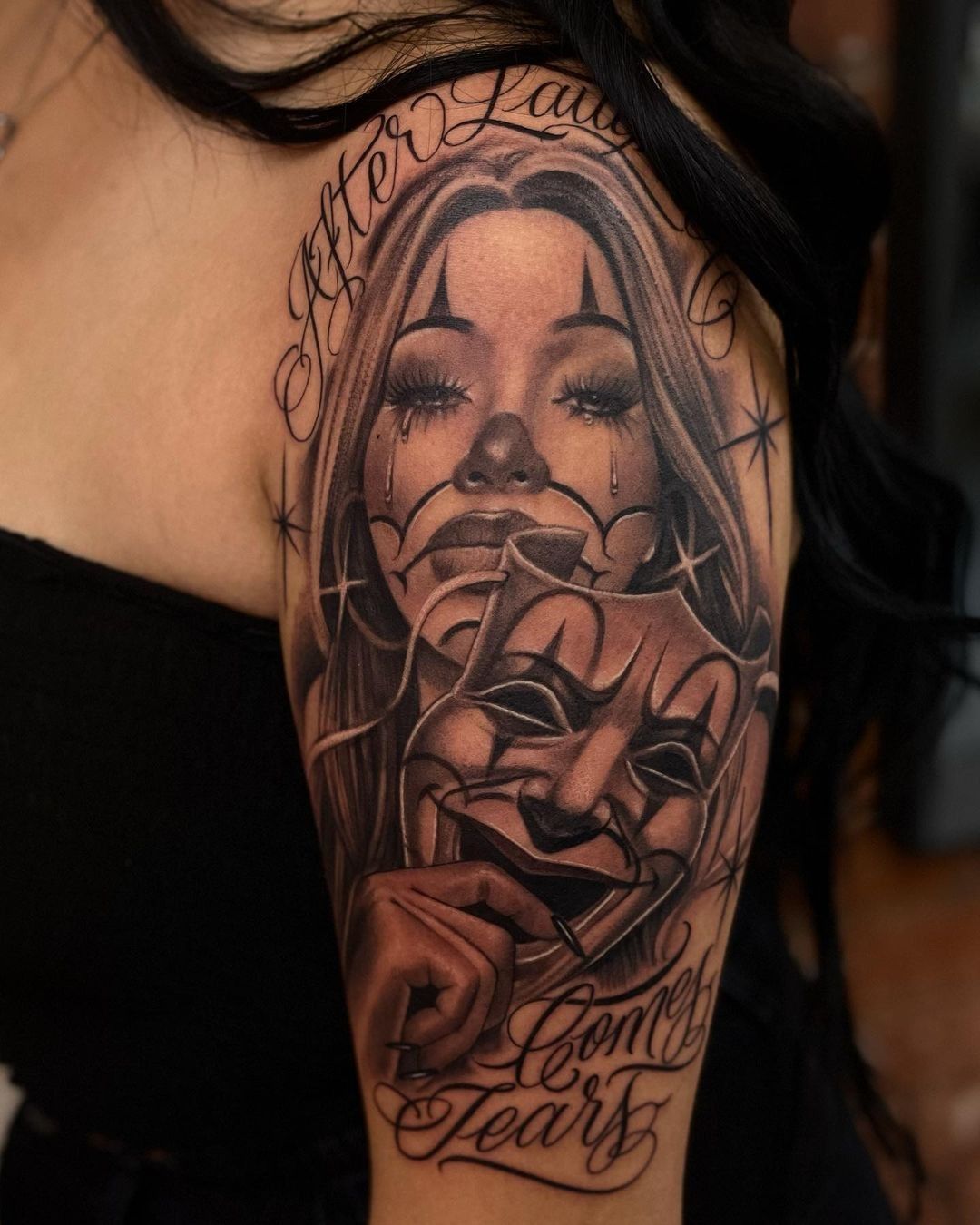 This tattoo feels like tradition wrapped in attitude. The dramatic mask imagery paired with flowing Scritta creates a sense of duality—strength and vulnerability living side by side. It’s bold, theatrical, and deeply rooted in Chicano storytelling, the kind that never goes out of style.